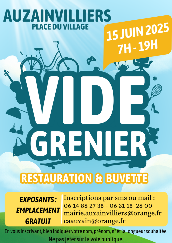 Le COMITÉ D’ANIMATIONS organise un VIDE GRENIER à AUZAINVILLIERS, dimanche 15 juin, de 7 h à 19h00. Buvette et restauration sur place. Emplacement gratuit, réservations par SMS au 06 31 15 01 00 (ou 06 14 88 27 35) ou par mail : caauzain@orange.fr.