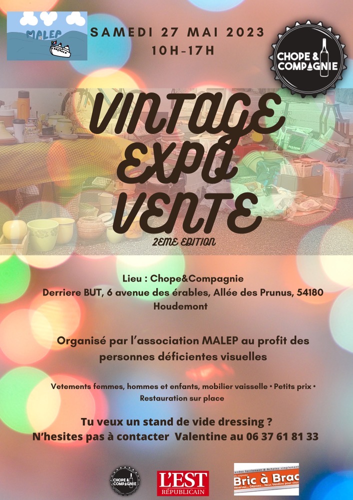 L’association MALEP organise son Vintage Expo Vente samedi 27 mai de 10h à 17h au Chope et Compagnie à HOUDEMONT. Vente d’articles à prix raisonnables : vêtements, petits mobiliers, vaisselles, livres. Restauration sur place. Tous les bénéfices seront reversés à MALEP, association qui aide les personnes déficientes visuelles.