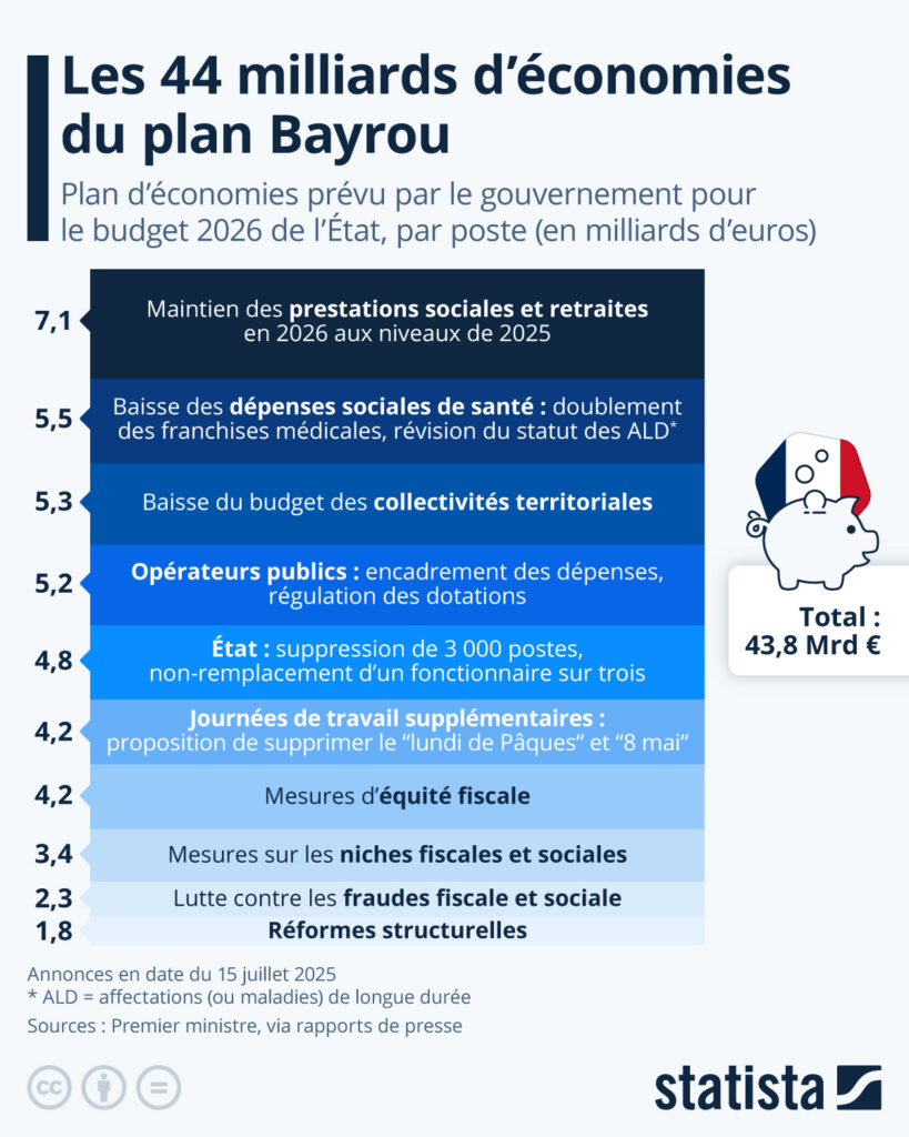 Le projet du budget 2026 repose sur des décisions fortes : gel des dépenses publiques hors défense et remboursement de la dette, suppression de 3 000 postes dans la fonction publique, durcissement des conditions d’indemnisation chômage, désindexation partielle des prestations sociales et des retraites, limitation de l’augmentation de l’ONDAM (objectif national des dépenses d’assurance maladie), et même, mesure la plus symbolique, la suppression de deux jours fériés : le lundi de Pâques et le 8 mai.