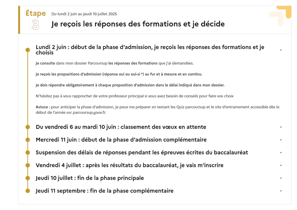 Chaque matin, les dossiers des candidats sont mis à jour en fonction de l’évolution des listes d’attente : dès qu’ils reçoivent une ou plusieurs propositions d’admission (auxquelles ils doivent répondre avant la date limite indiquée dans leur dossier), ils sont alertés par mail et SMS, ainsi que leurs parents s’ils ont saisi leurs coordonnées.