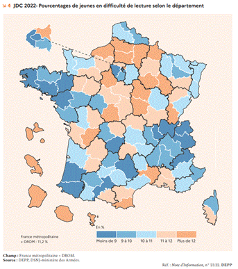 On trouve un exemple flagrant entre la France métropolitaine et les DROM (départements et régions d’outre-mer). Le pourcentage des élèves rencontrant des difficultés pour la lecture dans les DROM est élevé à plus de 12 % comparé à la France métropolitaine où rare sont les départements qui dépassent ce pourcentage.