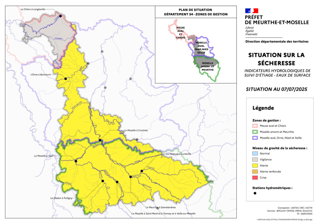 Le 4 juillet, Françoise Souliman, préfète de Meurthe-et-Moselle, a annoncé le passage en alerte sécheresse des zones dites « Moselle amont et Meurthe » et « Moselle aval, Orne, Nied et Seille ». La zone « Meuse aval et Chiers » reste, quant à elle, en vigilance. Depuis le 22 mai, le département était déjà placé en vigilance, mais la conjonction des conditions météorologiques — canicule, fort ensoleillement et vent sec — a fragilisé encore davantage la ressource en eau.