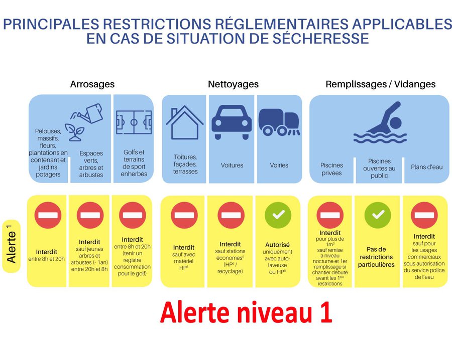 Un arrêté préfectoral précise les mesures qui s’appliquent désormais à tous les usagers de l’eau, qu’ils soient collectivités, industriels, agriculteurs ou particuliers. Ces mesures sont proportionnées à l’intensité de la sécheresse, mais visent à limiter fortement la consommation.