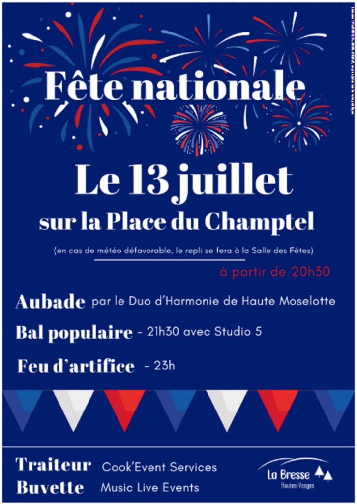 Le dimanche 13 juillet, à partir de 20h30, une soirée festive, aubade par le duo d’Harmonies de la Haute Moselotte vont prendre possession de la place du Champtel à La Bresse.