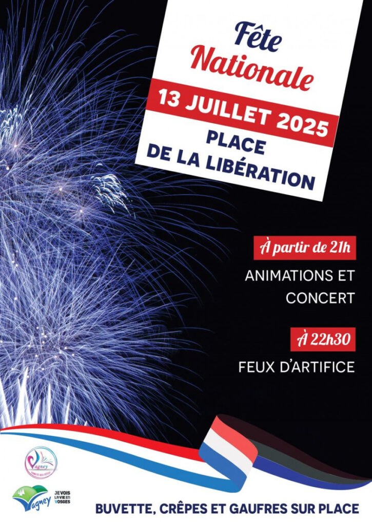 À l’occasion des festivités du 14 juillet et de la Fête Nationale, la commune de Vagney convie les habitants à une soirée animée au stade des Viaux, où se mêleront spectacle, danse et feu d’artifice.