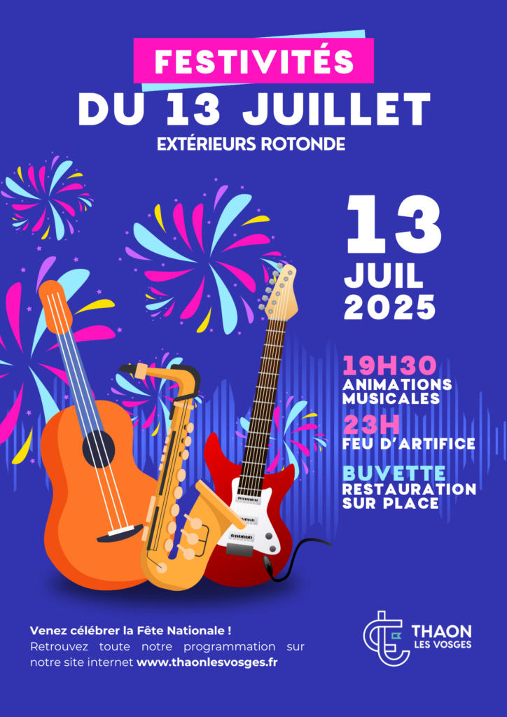 À l’occasion de la Fête Nationale, la Ville de Thaon-les-Vosges a le plaisir d’inviter le public à participer à deux journées de festivités conviviales et familiales, les 13 et 14 juillet prochains.