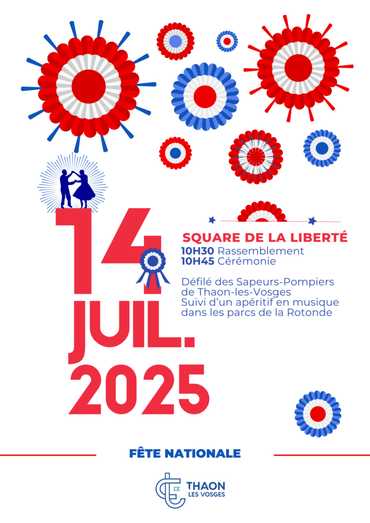 La Fête Nationale débutera à 10h30 avec le rassemblement pour la cérémonie officielle, suivi du traditionnel défilé des Sapeurs-Pompiers de Thaon-les-Vosges qui se conclura en musique autour d’un apéritif offert dans les parcs de la Rotonde.