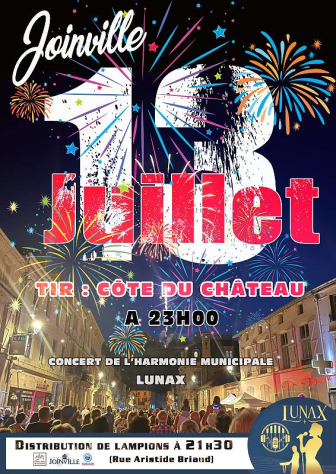À l’occasion de la Fête nationale, la ville de Joinville proposera une soirée festive et musicale. Les festivités débuteront avec un concert de l’harmonie municipale Lunax, suivi à 21h30 de la distribution de lampions pour les enfants.