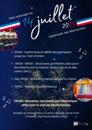 La Ville de Neufchâteau donne rendez-vous à ses habitants, le 14 juillet, jour de la Fête Nationale, pour une journée festive et familiale, placée sous le signe de la musique, des animations et du partage. Un programme riche attend petits et grands ce samedi, avec des temps forts tout au long de la journée.