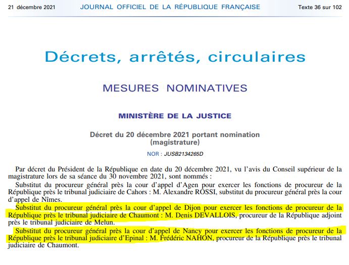 C’est chose faite là également puisque c’est un magistrat en poste en région parisienne, à Melun plus exactement, qui va occuper les fonctions de procureur de la république de Chaumont, Denis Devallois.