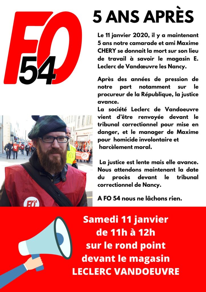 Le 11 janvier 2020, Maxime Chéry, employé chez E.Leclerc Vandœuvre-lès-Nancy se donnait la mort par arme à feu sur son lieu de travail. Comme chaque année à la date anniversaire de sa mort, le syndicat de l’Union Départementale Force Ouvrière 54 et les proches de la victimes manifesteront devant l’hypermarché, demain, samedi.