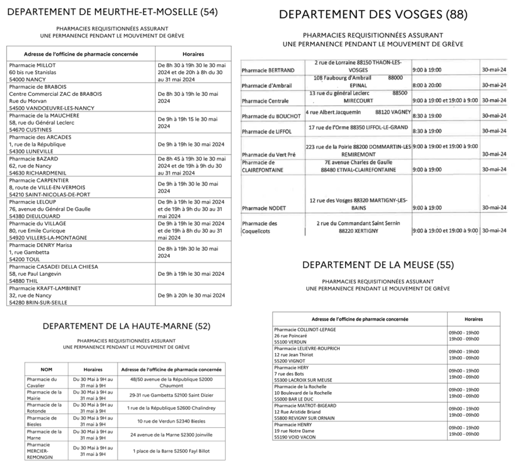 L’Agence Régionale de Santé (ARS) conseille d’appeler le Samu (15) en cas d’urgence et de rechercher les pharmacies réquisitionnées par les préfectures. En voici les listes, par départements :