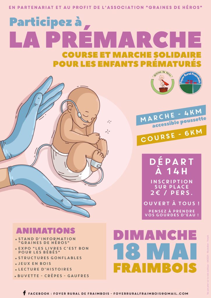 Participez à la Prémarche solidaire de Fraimbois le 18 mai 2025 au profit de l’association Graine de Héros, engagée pour le bien-être des bébés prématurés et de leurs familles. Marche, course, animations et partage au programme.